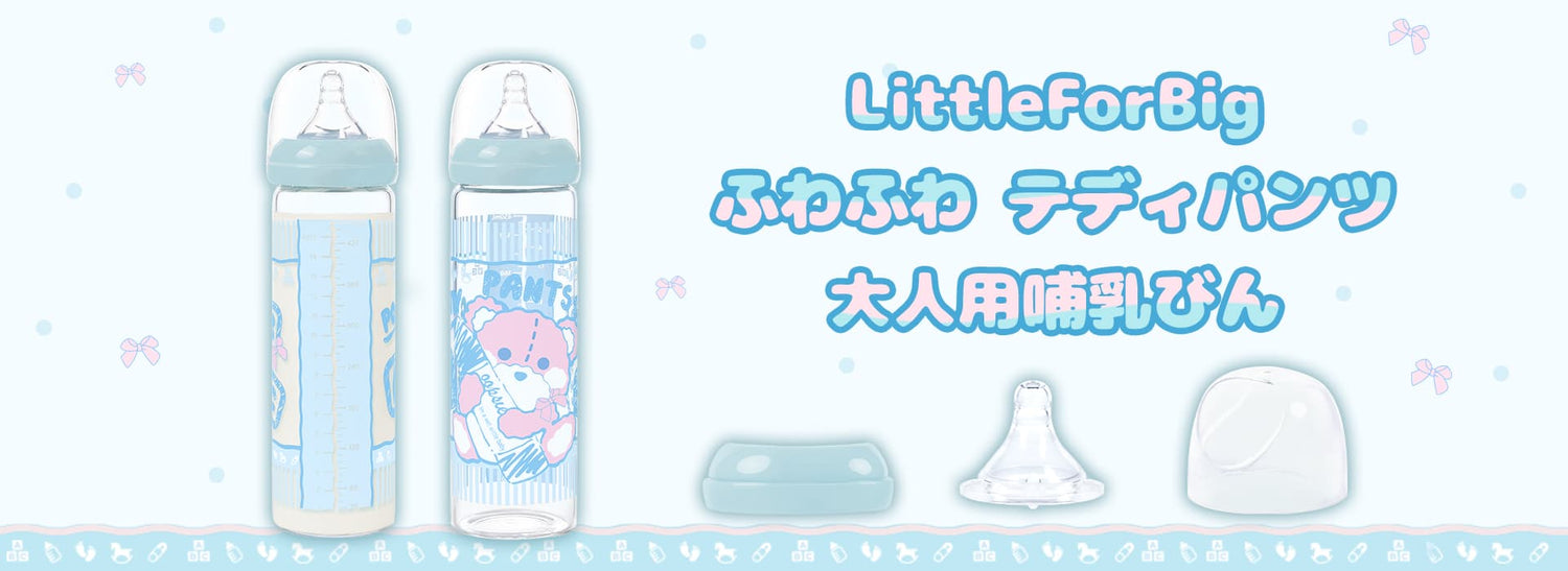 LittleForBig大人用哺乳びん【テディパンツ】防塵蓋付き 大容量450mL 引き換え可能なシリコーンニップル 大人向けグラス哺乳瓶 ブルー BTL06
