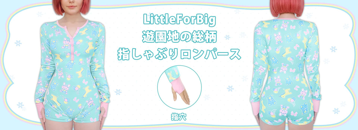 LittleForBig大人長袖ロンパースパンツ【遊園地】総柄 サムホール付きとリブ編み 前開き ベア型ボタン シルキー 緑 DP0043V