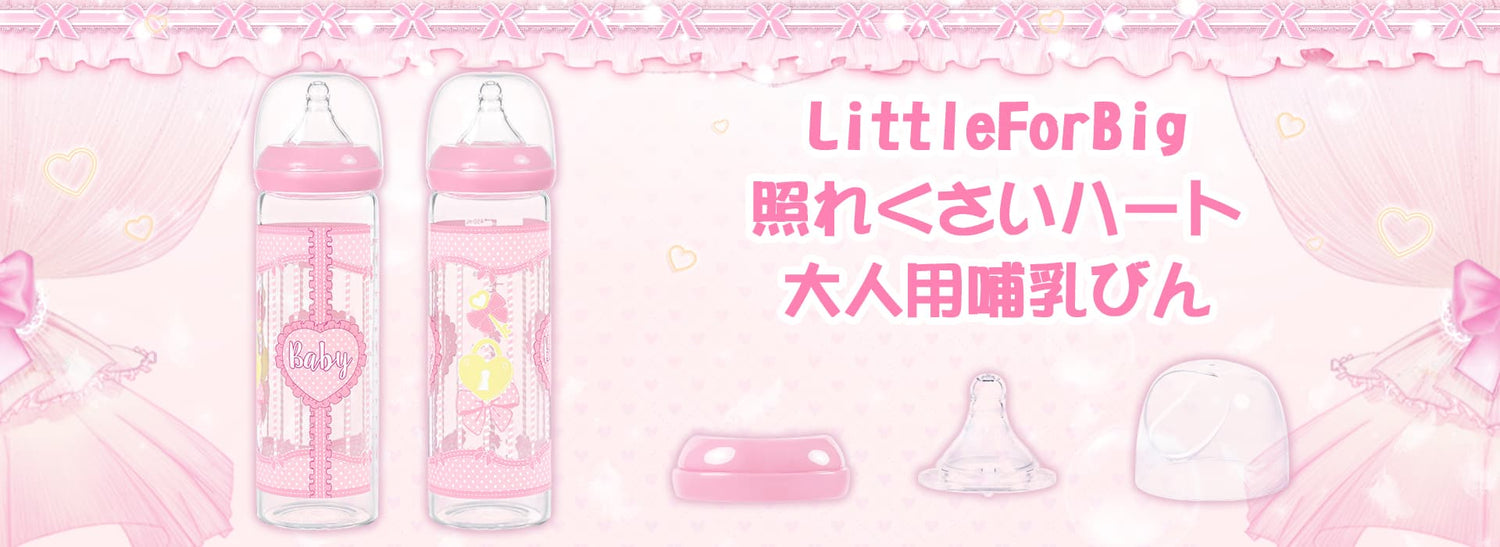 LittleForBig大人用哺乳びん【照れくさいハート】防塵蓋付き 大容量450mL 引き換え可能なシリコーンニップル 大人向けグラス哺乳瓶 ピンク BTL07