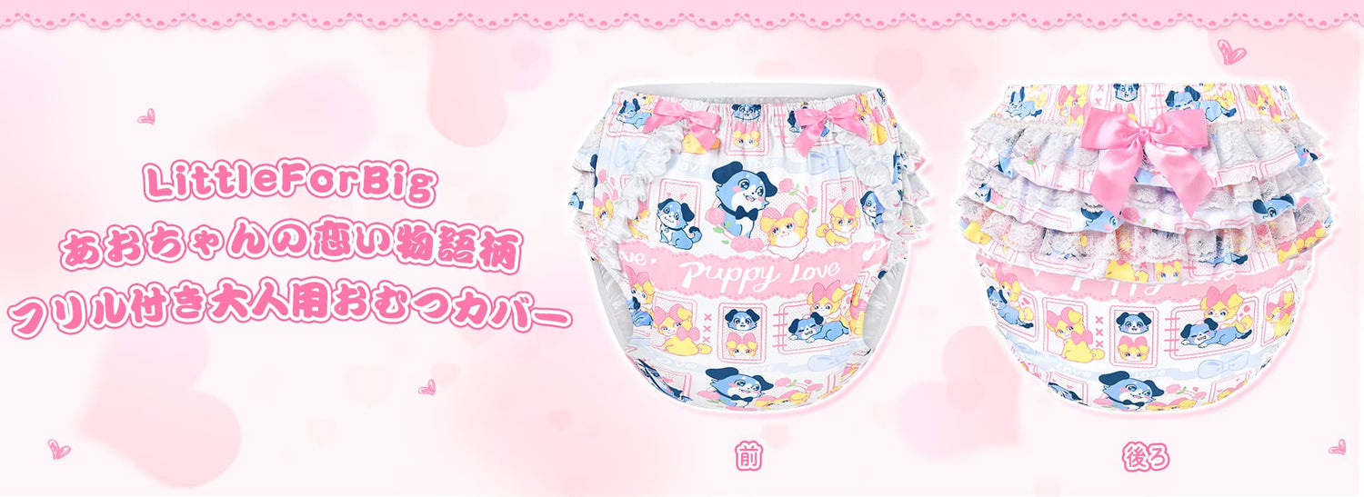 LittleForBig大人用シルキーおむつカバー【あおちゃんの恋い物語】バックに3層重ねレースフリル 大きなリボン飾り ストレッチウェストで快適 防水・漏れ防止 洗濯可 ピンク DC208P
