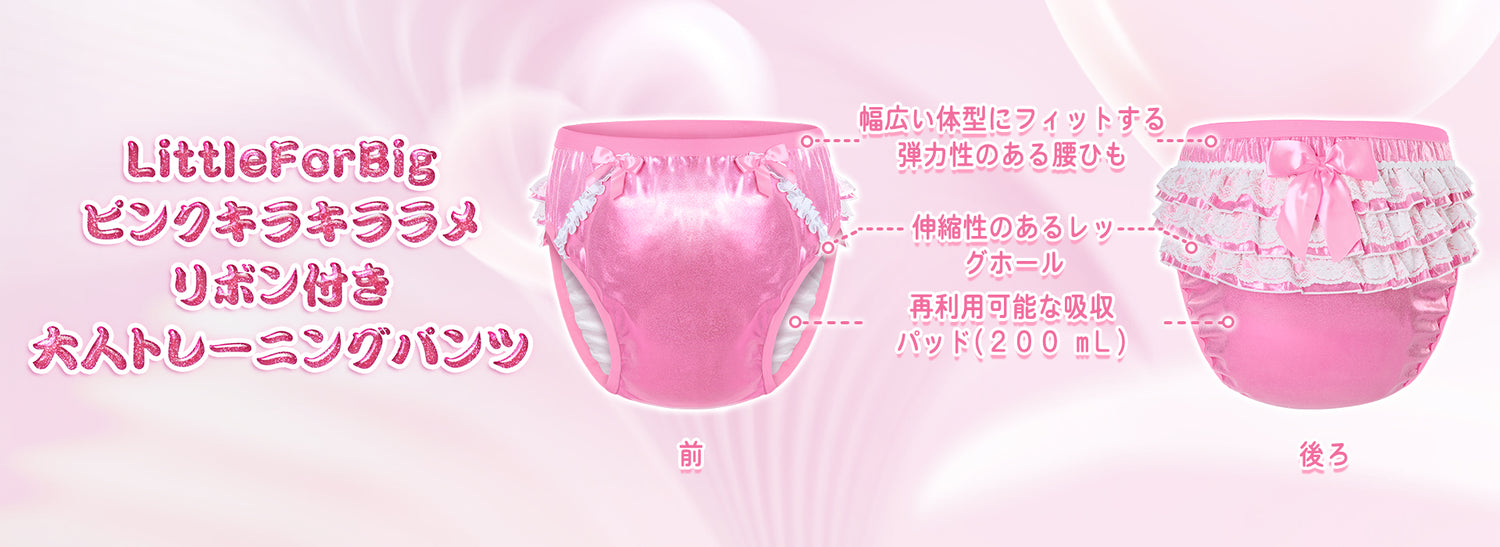 LittleForBig大人単体で使えるトレーニングパンツ キラキラ光る【お姫様スカート】バックに3層重ねレースフリル 大きなリボン飾り ストレッチウェスト 防水・漏れ防止 洗濯可 ピンク DC317P