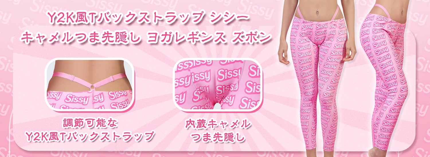 LittleForBigメンズズボン レギンス ヨガパンツ【シシー世界へようこそ】総柄 Y2K風 キャメルつま先隠し シルキー 調節可能なTバックストラップ ピンク MYP002P