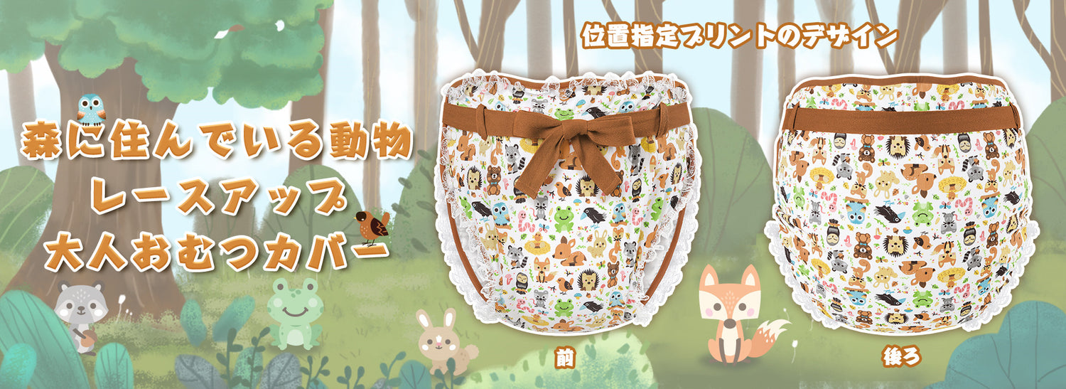 LittleForBig大人用綿おむつカバー【森に住んでいる動物】コーデュロイ生地 レースと蝶結び 調整可ウェスト 3層通気性・防水・漏れ防止 洗濯可 ブラウン DC408N