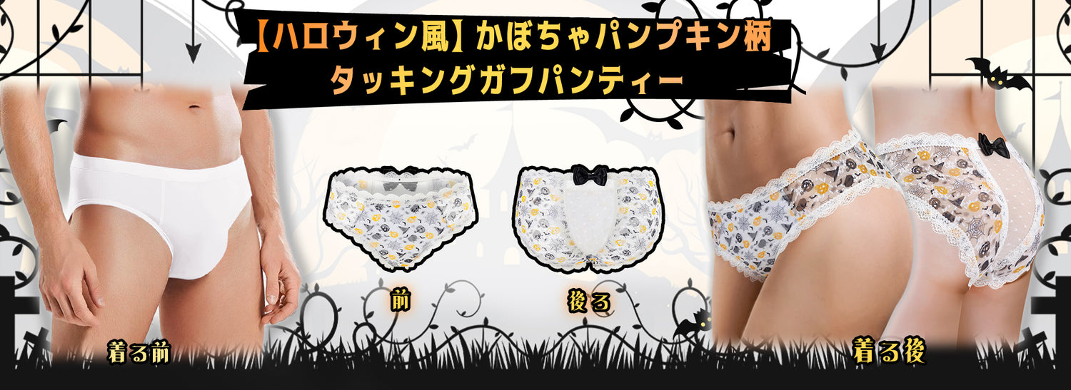 LittleForBigメンズパンティー 体型カバー【スケリー·魔女の帽子·クモの巣柄】ハロウィン風 タッキングガフパンティー ブリーフ バックにメッシュパネルと大きなリボン 白 MUP514W