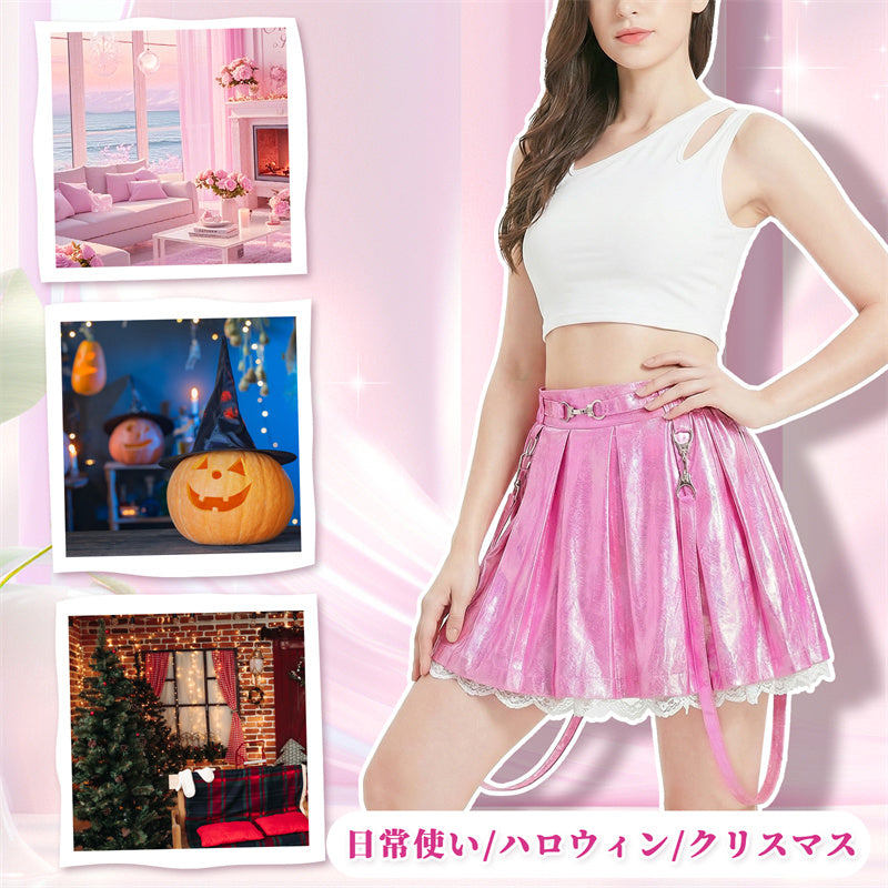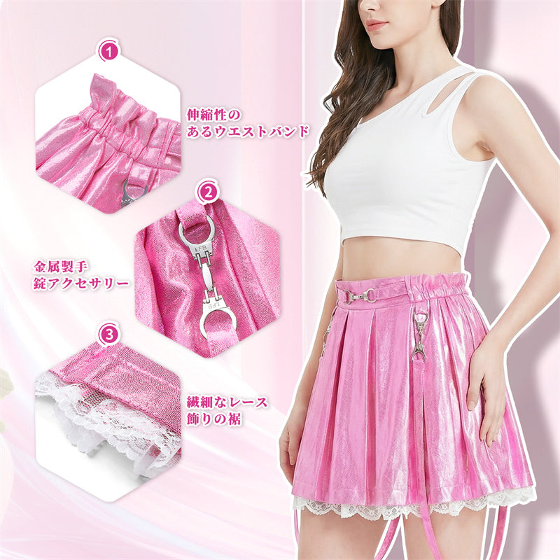 • 【眩い輝きのメタリック生地】眩いばかりの輝きを放つメタリック生地で作られたこのミニスカート。金属製手錠アクセサリーをあしらったデザインが、動くたびに光を捉え、あなたが注目の的であり続けることを約束します。