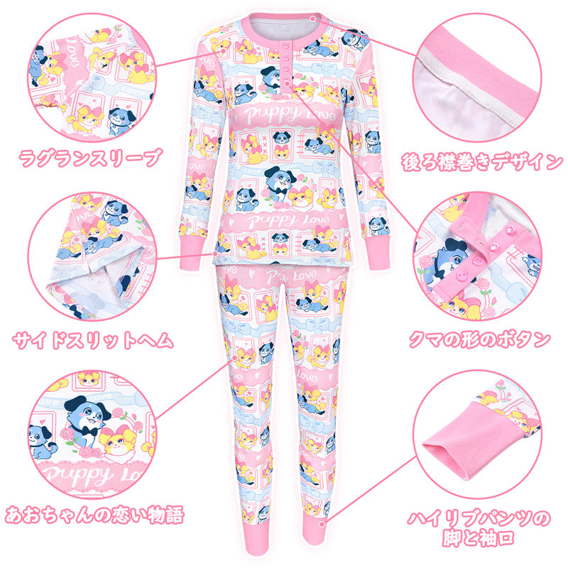 LittleForBig大人シルキーパジャマ2点セット【あおちゃんの恋い物語】長袖とズボン 部屋着 伸縮性 ユニセックス ピンク AT627