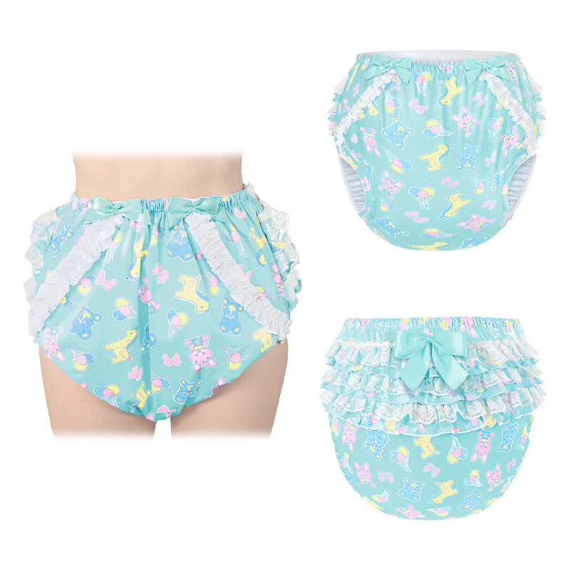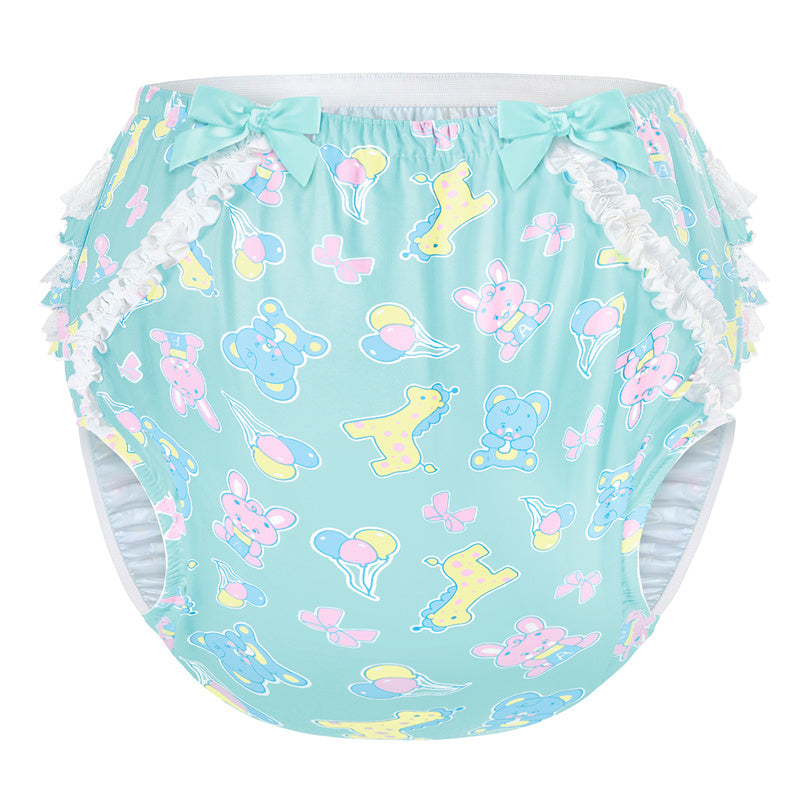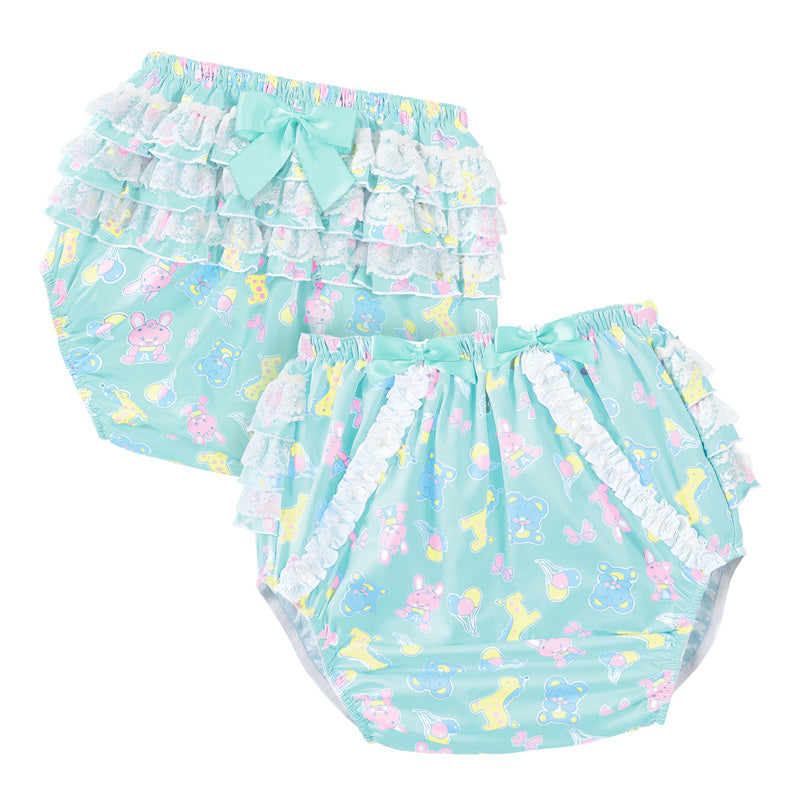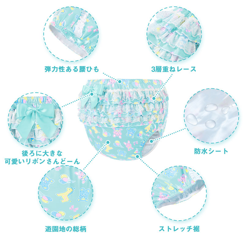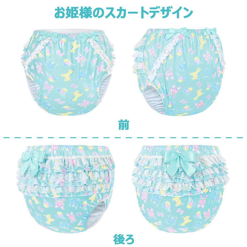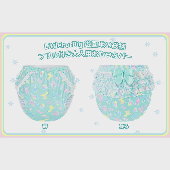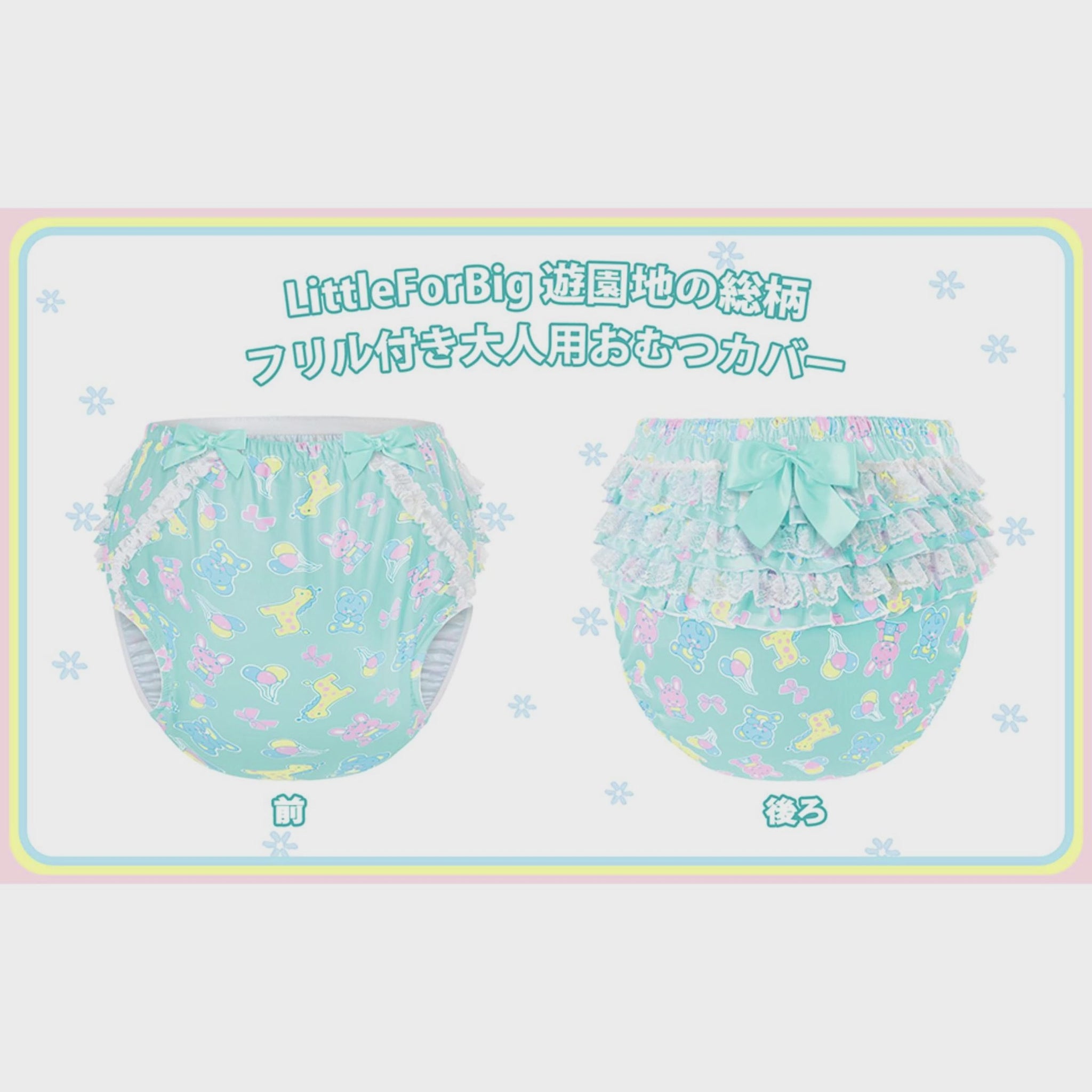 LittleForBig大人用シルキーおむつカバー【遊園地】総柄 バックに3層重ねレースフリル 大きなリボン飾り ストレッチウェストで快適 防水・漏れ防止 洗濯可 緑 DC205V