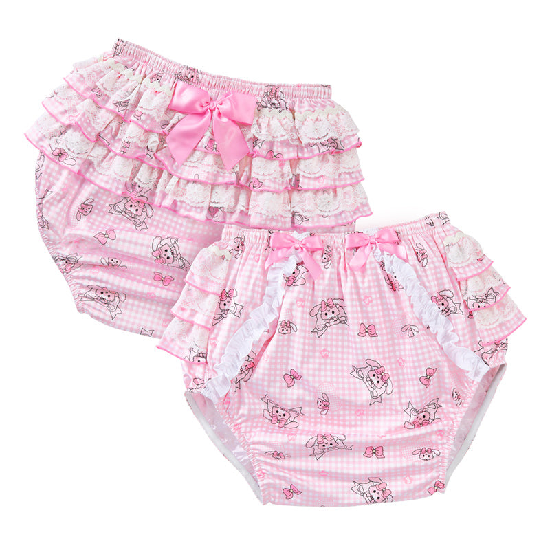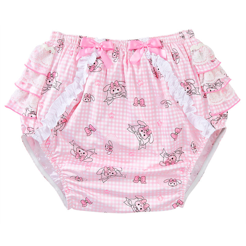 LittleForBig大人用シルキーおむつカバー【うさぎとリボン】格子縞 バックに3層重ねレースフリル 大きなリボン飾り ストレッチウェストで快適 防水・漏れ防止 洗濯可 ピンク DC207P