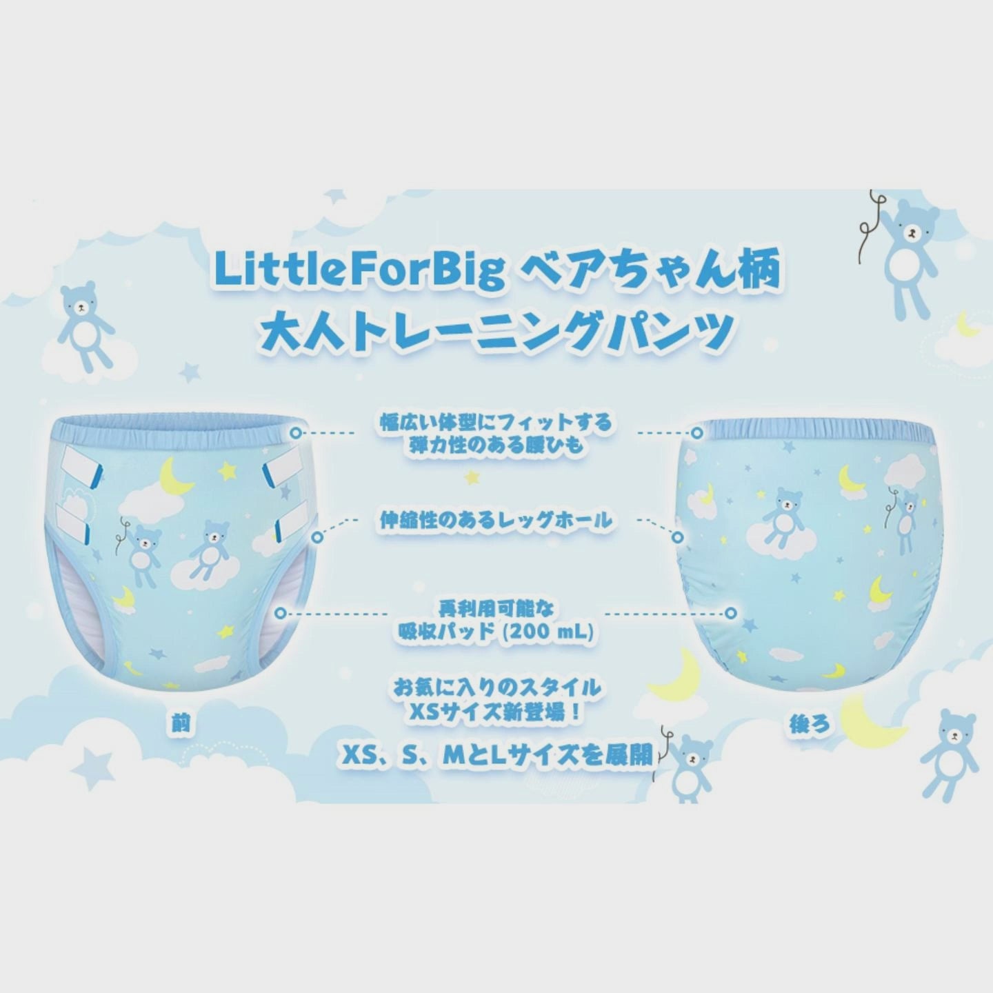LittleForBig大人用シルキー単体で使えるトレーニングパンツ【ベアちゃん】ウェストゴム付き 吸収層入り 通気性 洗濯可 快適フィット ブルー DC304B