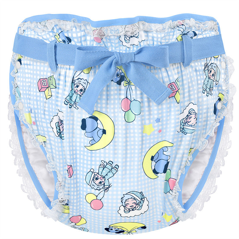 LittleForBig大人用シルキーおむつカバー【あおちゃん·寝る時間】総柄 レースと蝶結び 調整可ウェスト 3層通気性・防水・漏れ防止 洗濯可 ブルー DC409B