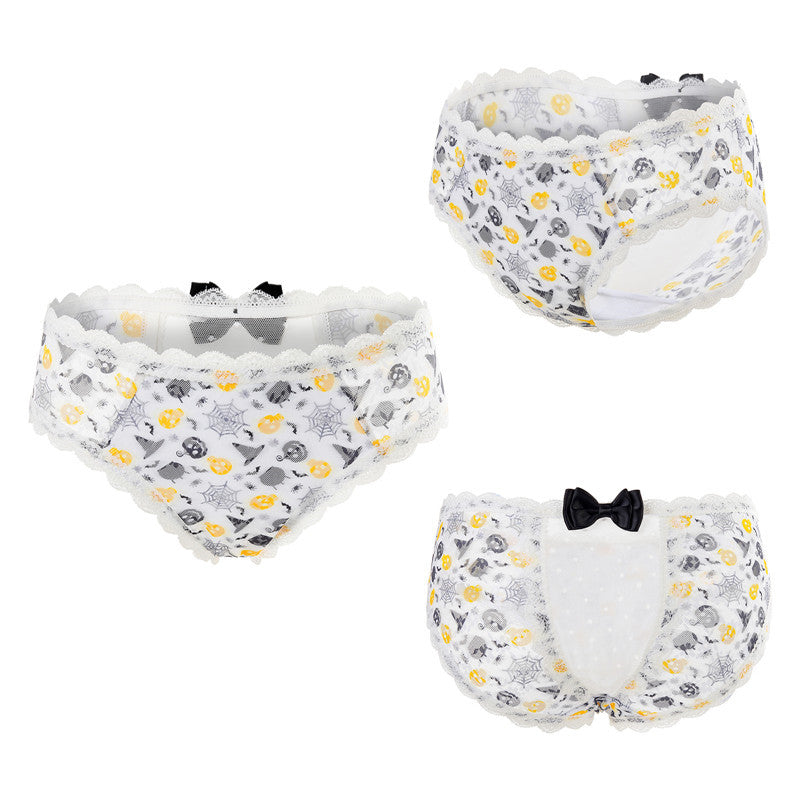 LittleForBigメンズパンティー 体型カバー【スケリー·魔女の帽子·クモの巣柄】ハロウィン風 タッキングガフパンティー ブリーフ バックにメッシュパネルと大きなリボン 白 MUP514W