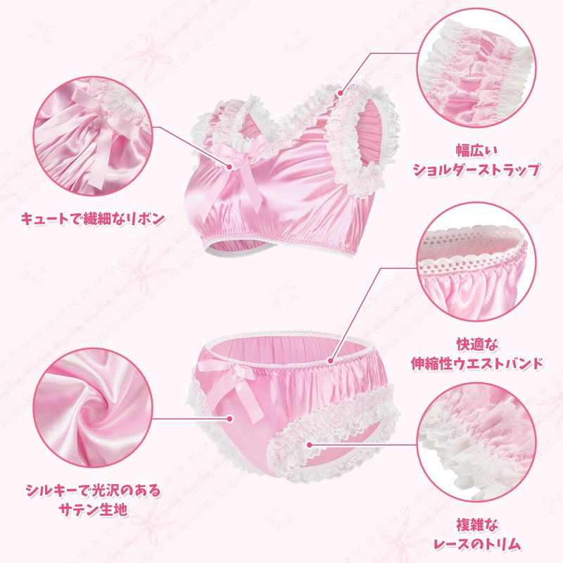 LittleForBigユニセックス ブラレット2点セット【光沢サテン】レースフリルとリボン付き 繻子質感 シルキーキャミソールとパンティー 部屋着 ピンク MUT266P