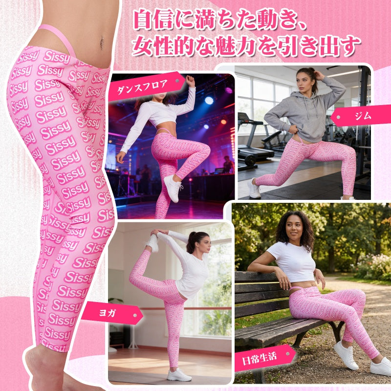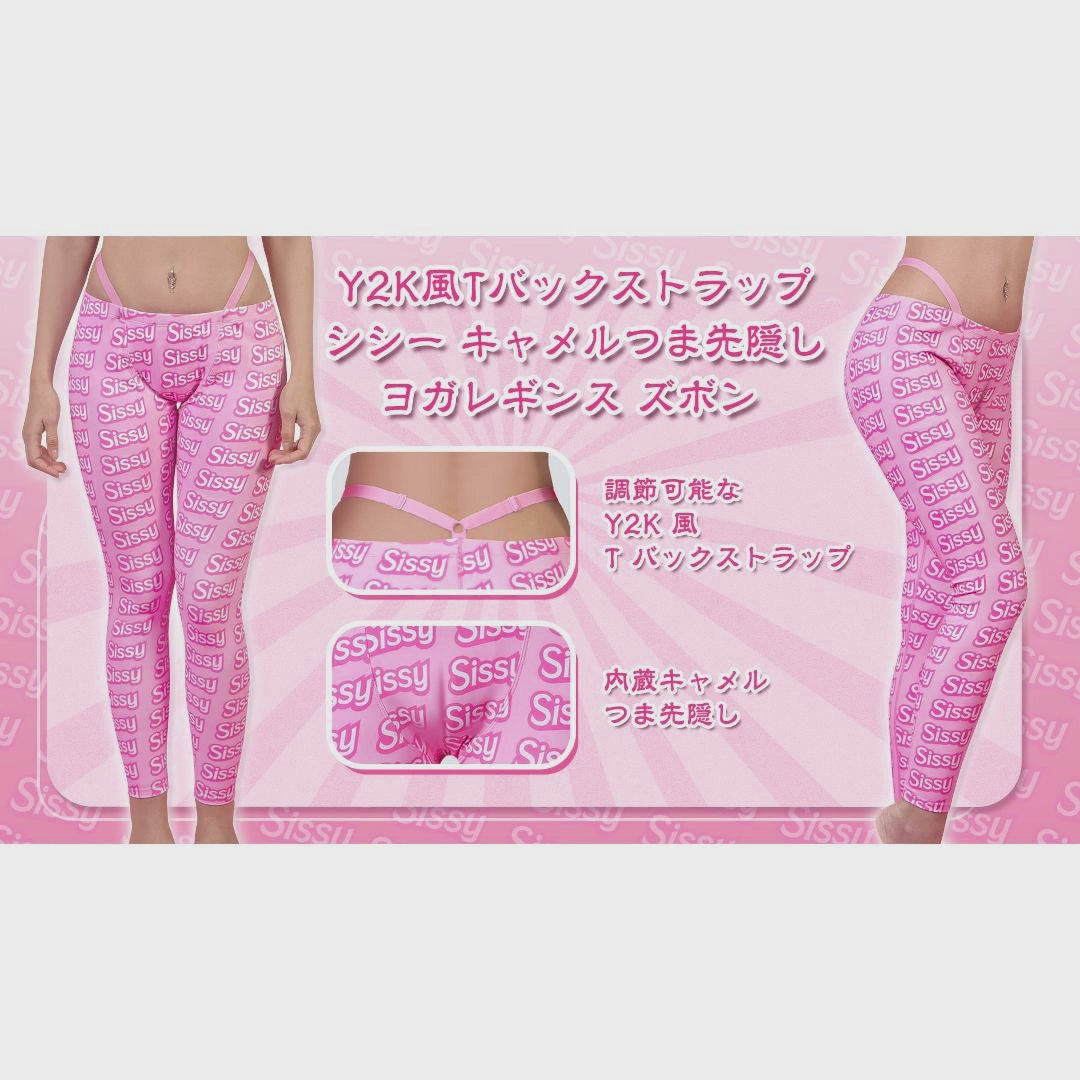 LittleForBigメンズズボン レギンス ヨガパンツ【シシー世界へようこそ】総柄 Y2K風 キャメルつま先隠し シルキー 調節可能なTバックストラップ ピンク MYP002P