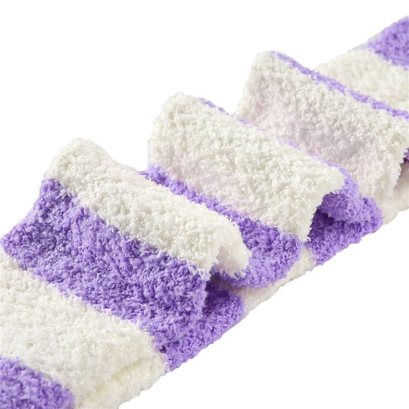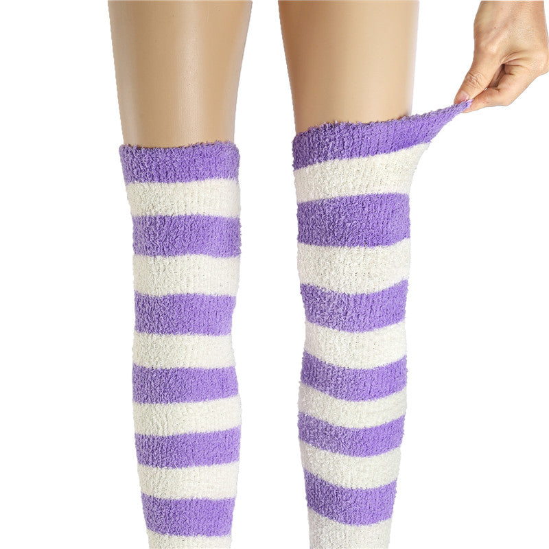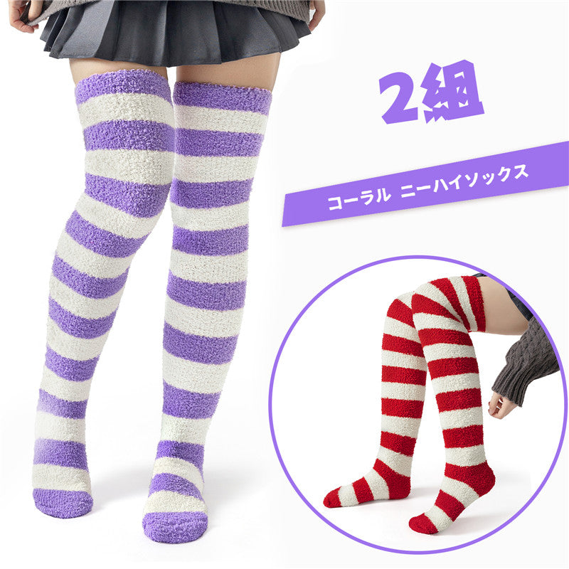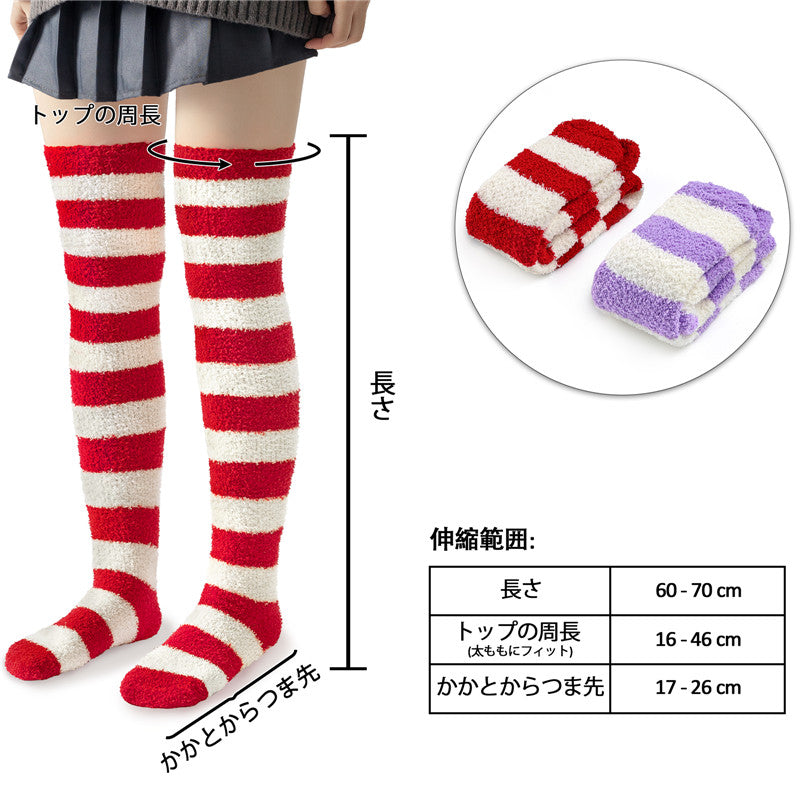 Littleforbigキュートなコーラルフリース ニーハイロングボーダー ストライプ ソックス2足セット 赤白&紫白